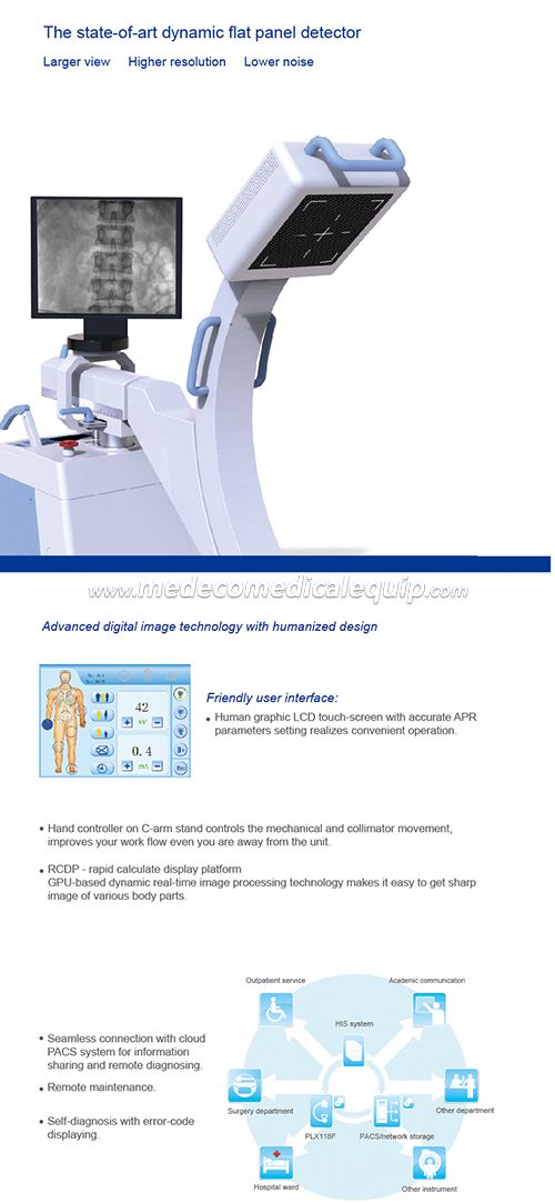 This C arm system is a necessary machine in Orthopedic department. It showed outstanding performance in restoring bone, trans-location, bone resetting and fixing; and performs well in many surgeries, including remove foreign matters, implant pacemaker in Spine surgery, general surgery and so on.